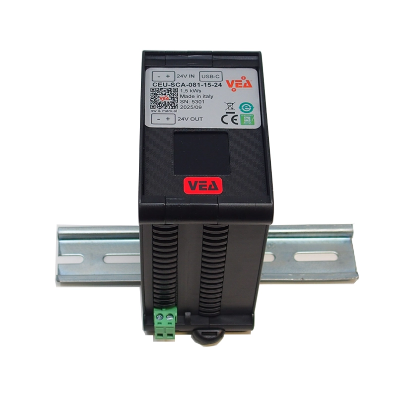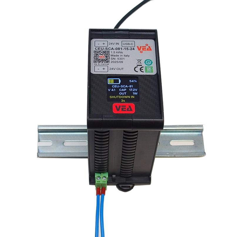 Maintenance-free super-capacitor UPS 80 W (peak 100 W), input voltage 24V, output voltage 24 V, energy storage 1,5 kW/s. UPS maintenance-free super-capacitor for industrial PC or PLC. Single conversion line-interactive on-line UPS without trip time or voltage variation when input voltage fails. Compact, 58 mm wide. Easy to use, immediately operational, no programming required. Simply connect the two “24V IN” terminals to the normal 24V power supply and connect the two “OUT” output terminals directly to the PC or PLC or other devices. If using a windows PC, download the software by connecting to the website by reading the QR-code on the ups label.